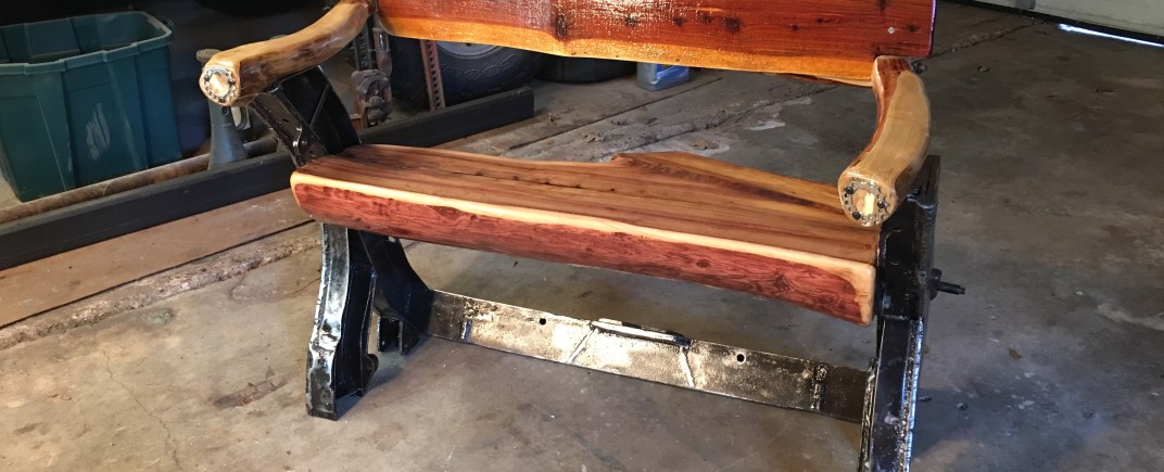 Most of the materials I work with are acquired either as leftovers from mechanical repairs or projects or are found in my day to day travels. On occasion things just fall into my lap, or in this case, they fall in my yard. The cycle of time brought about the demise of several trees in our yard, and some of the remains were too beautifully full of potential to dispose of. When we had to have a large Elm cut down, I saved several sections that I thought could become a set of benches. When I helped a friend cut up his old Jeep frame, I realized I had found the “frame” for one of the benches. I added limbs that I’d saved from a fallen Crepe Myrtle for the arms and a scrap piece of Cedar from a friend for the backrest. Worn-out bicycle sprocket gears provide the final accents to the fronts of the arms.