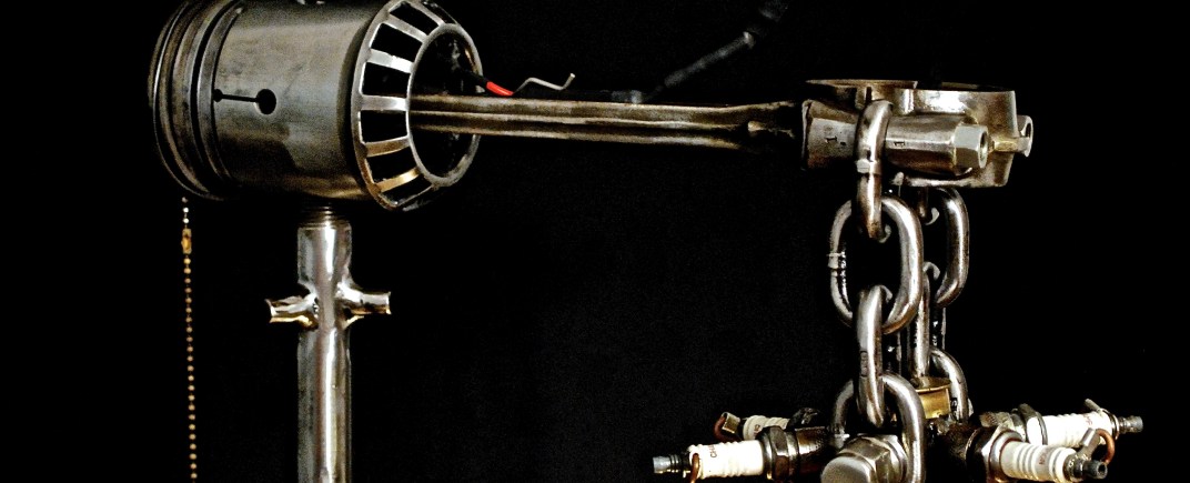 Most of my materials are given to me by friends, some I find in junk piles, others I salvage from things I disassemble. Occasionally though, I’ll find something in a store my eye insists should be something else. The glass shade on this lamp was just such an element. Originally is was a glass flower vase that I found in a clearance section while shopping for toilet paper. My wife was a little confused when I brought it home, but I insisted I had something in mind for it. I didn’t honestly know what exactly it was going to be beyond “a part of a lamp”, but I almost never let that stop me. Once I had the bottom cut off, I started working on the socket assembly and the structure that would suspend it. About that same time, a friend of mine brought by a rim from a ’48 Dodge Power Wagon that he was going to scrap, and I had my base. I used some gas pipe trimmed with brass collars and stabilized with teeth from a tractor bucket. I then tacked 45 conical roller bearings onto the vertical pipe for texture, and fitted an old Jeep piston to the top where I mounted a pull chain switch. The light fixture is suspended from the piston by two short sections of super heavy chain that allow it to swing slightly. I then mounted a secondary light within the truck rim on a separate switch; and hid all the visible wiring inside a section of copper pipe from an espresso machine. The finished piece is a little illumination from every corner that will light every corner around it.