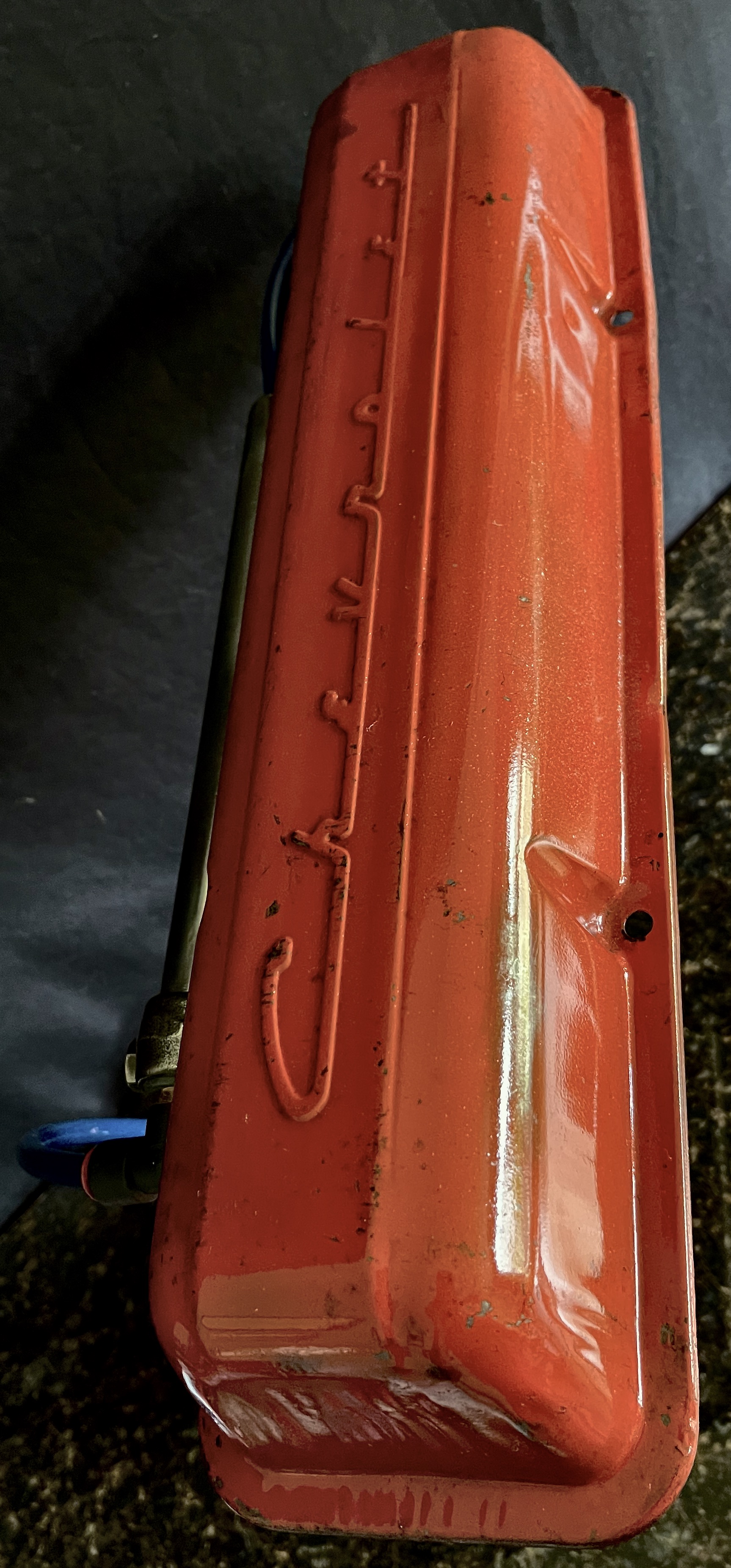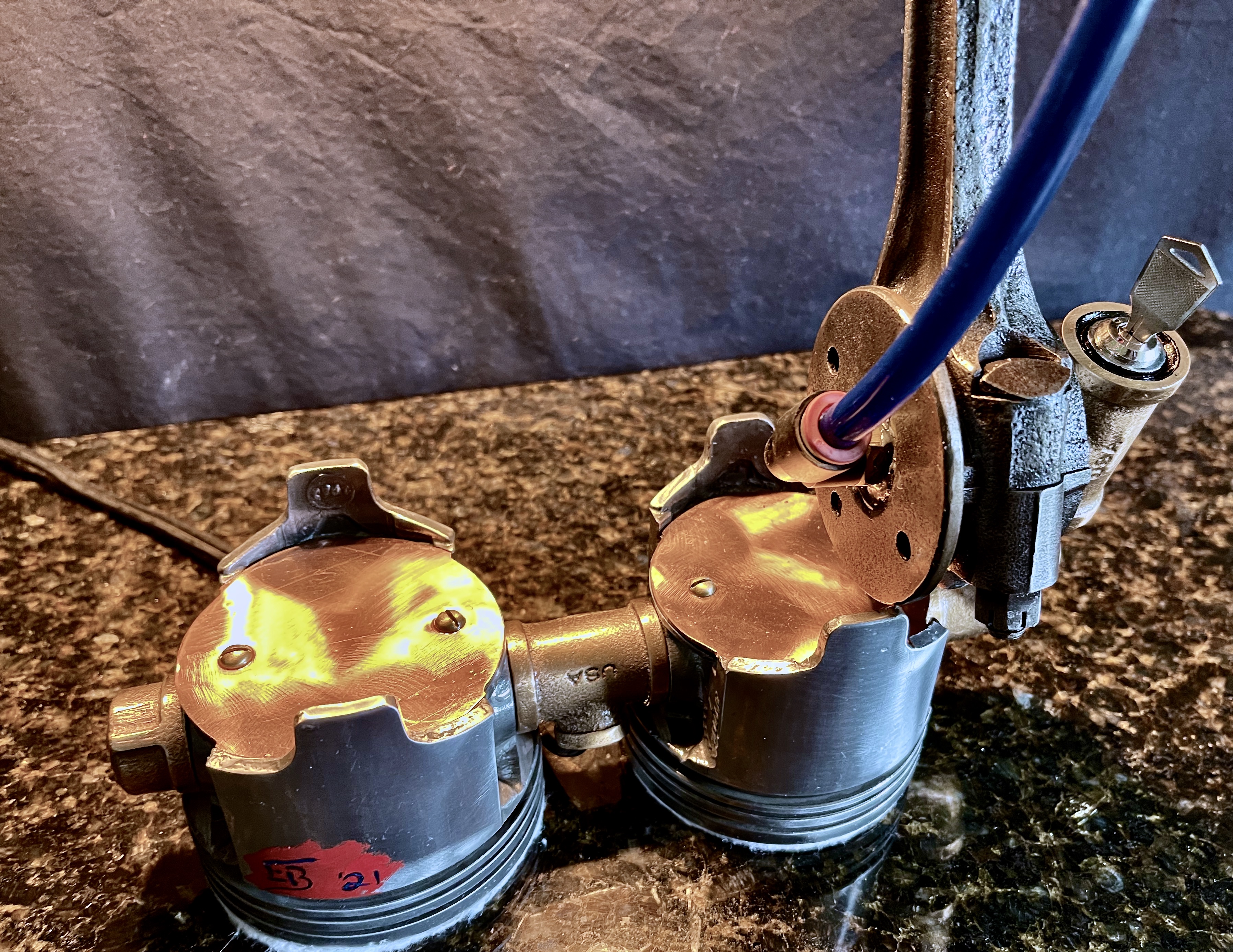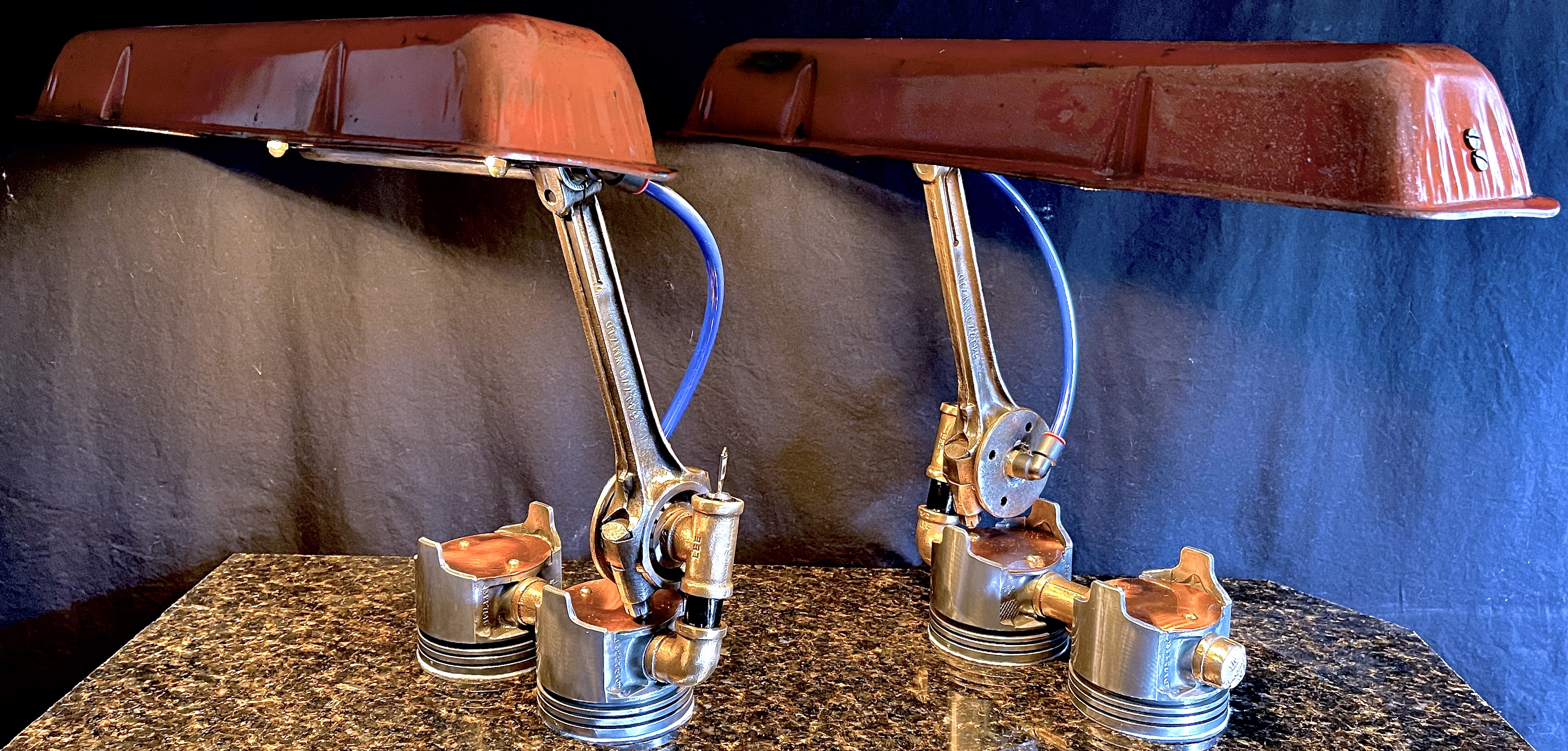 Why make one when you can make two? Normally the answer to this question for me is that I’ve only got enough of the key elements to make one. I have a whole box of valve covers, and shelf full of piston caps to play with though, so I thought I’d take a shot at working out an idea a few times. These lamps are the first try at that idea, and they turned out well enough that I might try a few more. I cantilevered a valve cover from an old Chevy off of a connecting rod from a four cylinder jeep over a set of used Chevy (I think?) piston cups. Those parts are worked together with half-inch gas pipe and brass fittings. The wiring on these lamps is hidden in some blue high-pressure push-connect air lines. The piston cups were filled with cement to add some weight, and then covered with disks I cut out from some copper sheet. Then, to really finish them off, I used keyed switches that have a very satisfying ‘click’ when actuated. Some ideas really are good enough to have more than once, I hope you agree.