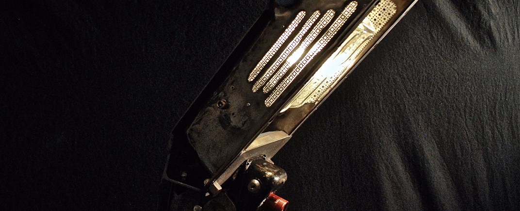 Sometimes an element is too big to go on top of a project. Sometimes I do it anyway. I started with an oil pan from a 1950’s Jeep motor and nestled two whiskey bottles inside for light shades that can pivot out to access the bulbs. I then used a satellite dish mounting bracket welded to a stainless steel pipe clamp fitting that attaches it atop a piece of steel pipe. I gave it three aircraft antenna feet with jet engine ignitor accents. The pull-for-power-push-to-stop switch is from an old elevator, and is set in an electric motor wiring cover.