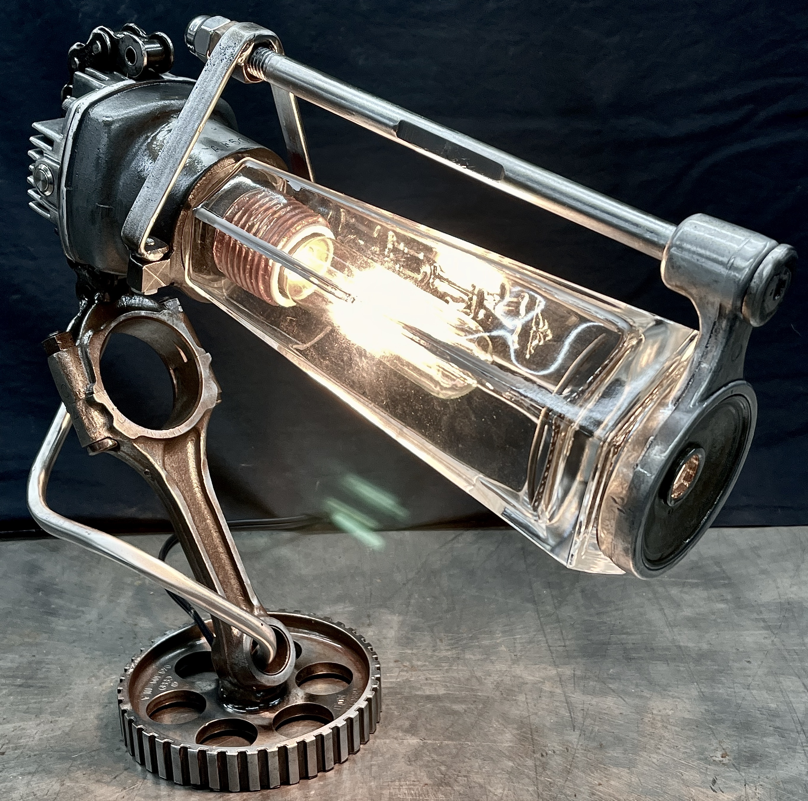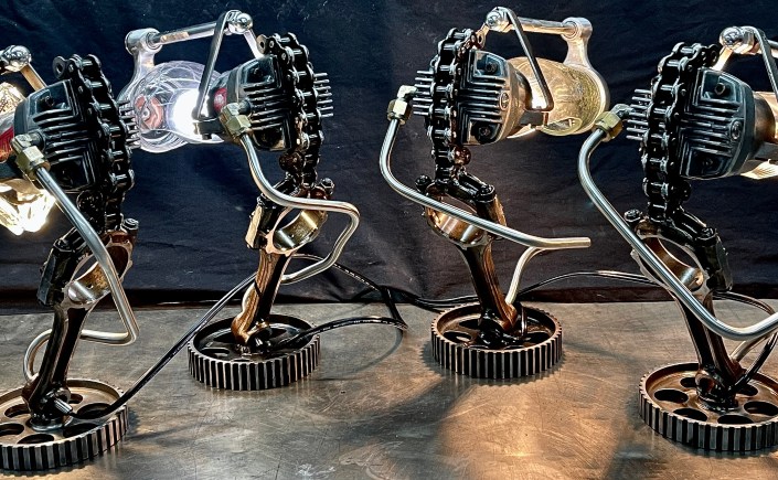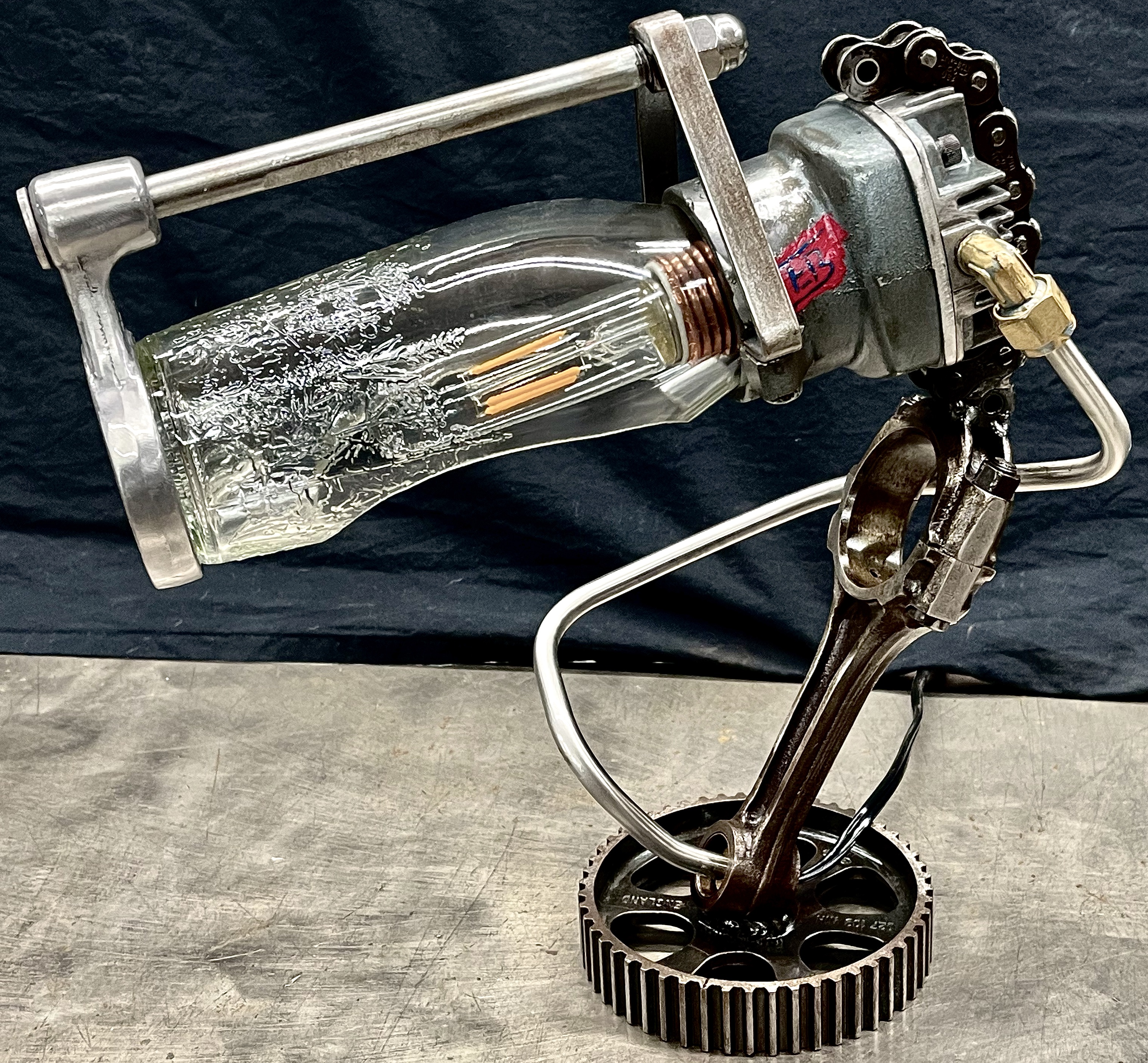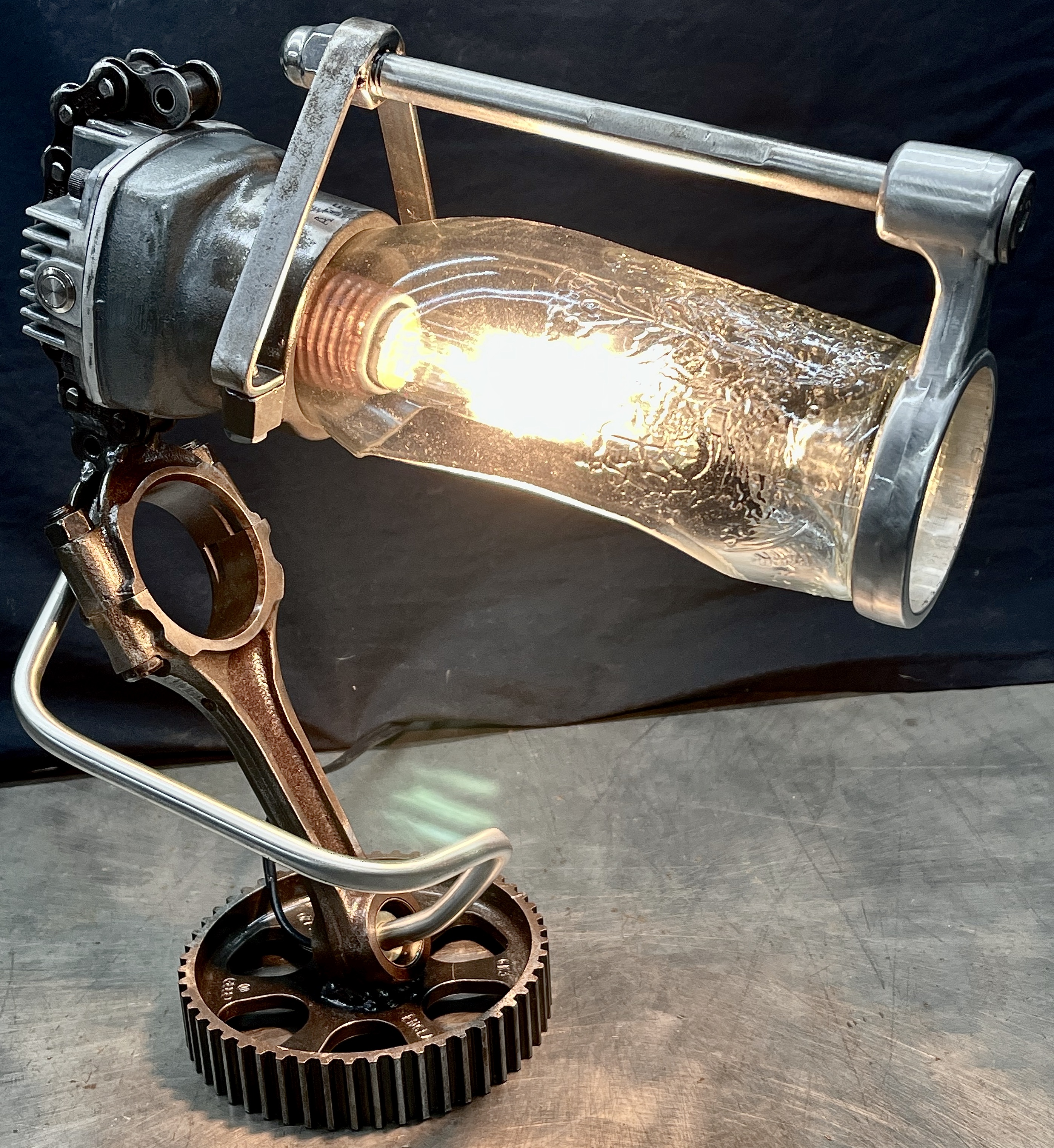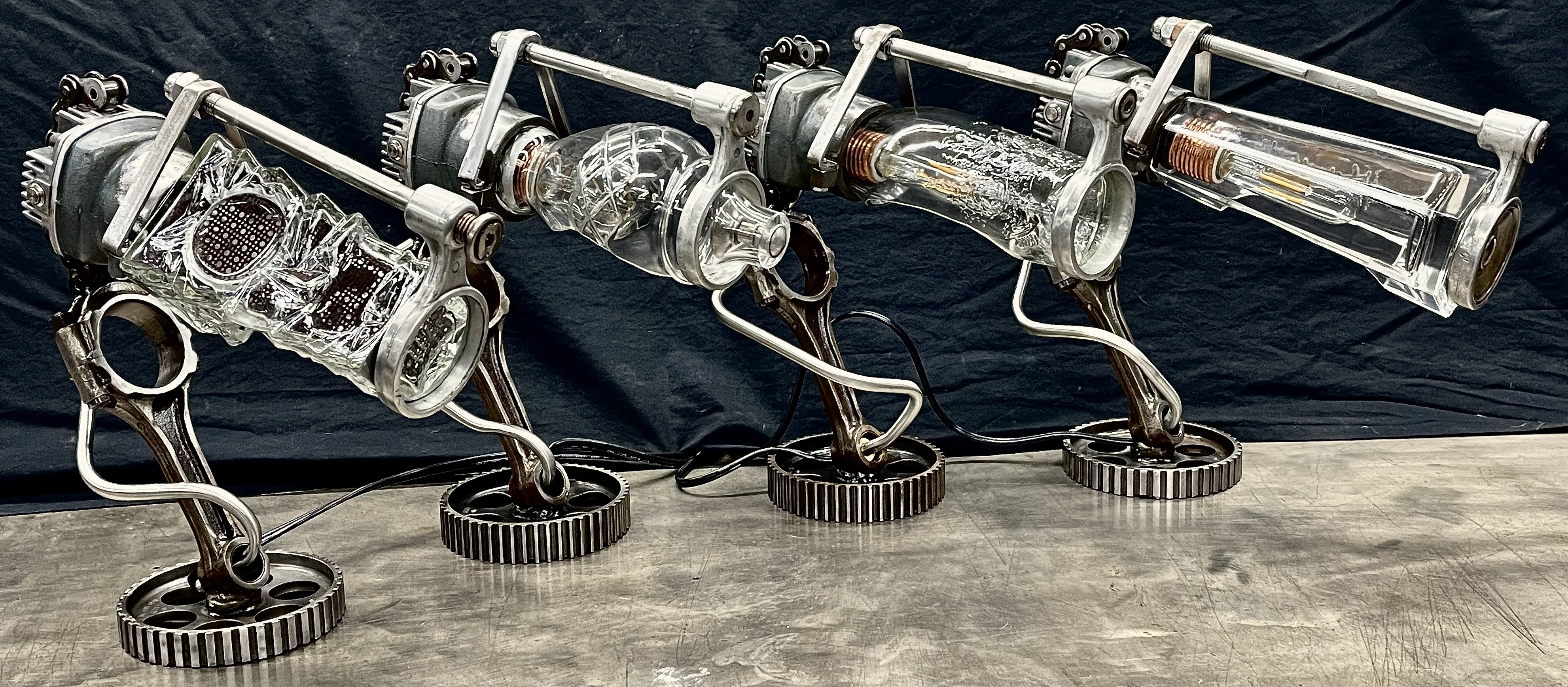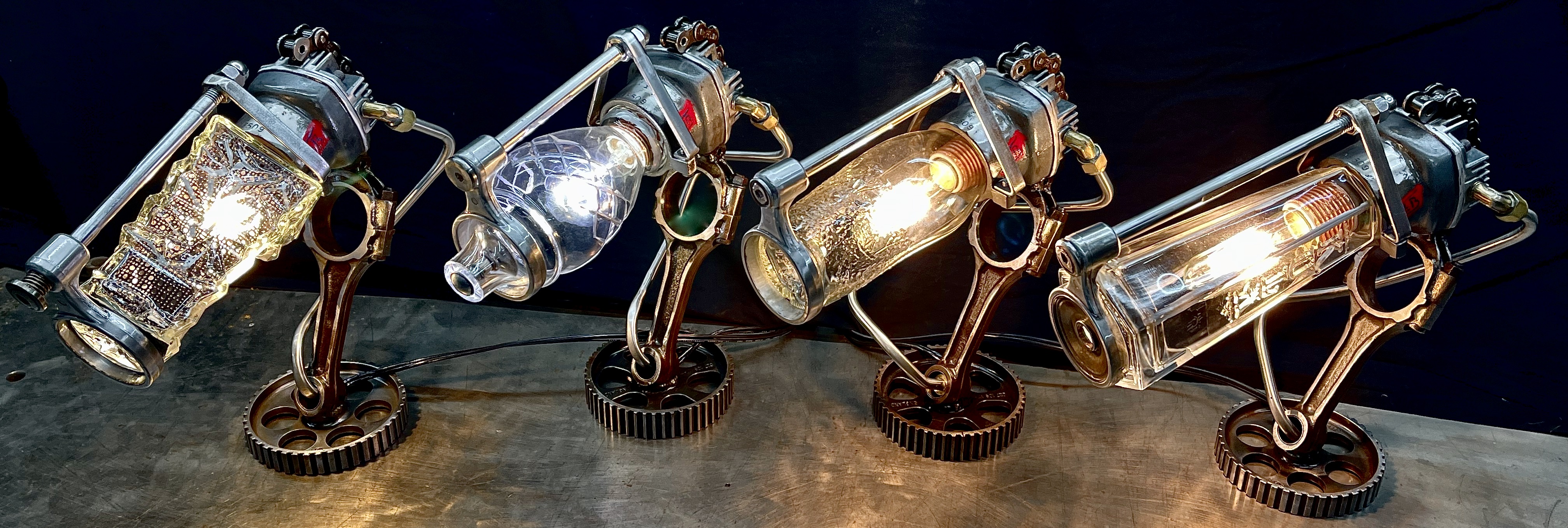 Why make only one lamp when you can make four instead? Because it’s a huge pain in the butt. I probably should have known this when I first came up with the idea, but then again, ‘bad decisions’ are kind of my wheelhouse. Lets rewind a little, a friend (we’ll call her ‘Helga’) texted me a picture of (what I later found out was) a sceptic tank aerator system air compressor that she found on the curb, and asked if I wanted her to grab it. I almost never say ‘no’ to trash, so I responded with an enthusiastic “sure.” After breaking it down and clearing out all of the spider carcasses/roach eggs, I was left with four aluminum compression cylinders/pistons and a bunch of brass air fittings. I thought to myself, “these would be really cool to fit a bottle into to make some lamps” and then promptly shoved everything to the side and did something else. Fast-forward nine months and I’m standing at my welding table with an empty tequila bottle that another friend had given us, thinking it would make a really cool lamp, and looking around at parts that I could use to flesh it out. Thats when I remembered the compressor cylinders, and the idea for one lamp was set. Problem was, I had four of those cylinders, and I was going to use all of them for lamps eventually anyway right? So why not just make four matching lamps right out of the gate? (for the correct answer, see above) What makes ‘Four’ so much more of a pain than ‘One’? Well, when you mostly make stuff out of junk, parts mostly don’t come in fours, and once you do have four of mostly matching sets, you get to degrease/polish/fit everything. The result is that, as soon as you’re ‘done’ doing something, you get to do it again three more times. To break up the monotony I elected to use a different style of bottle for each of the lamps. All in all I’m happy with these little lamps, and it is nice to see an idea that is solid enough that it can be repeated successfully, even when I hope never to repeat-repeat-repeat-repeat it again. Anyway, I hope you like them, and thanks again Kate.