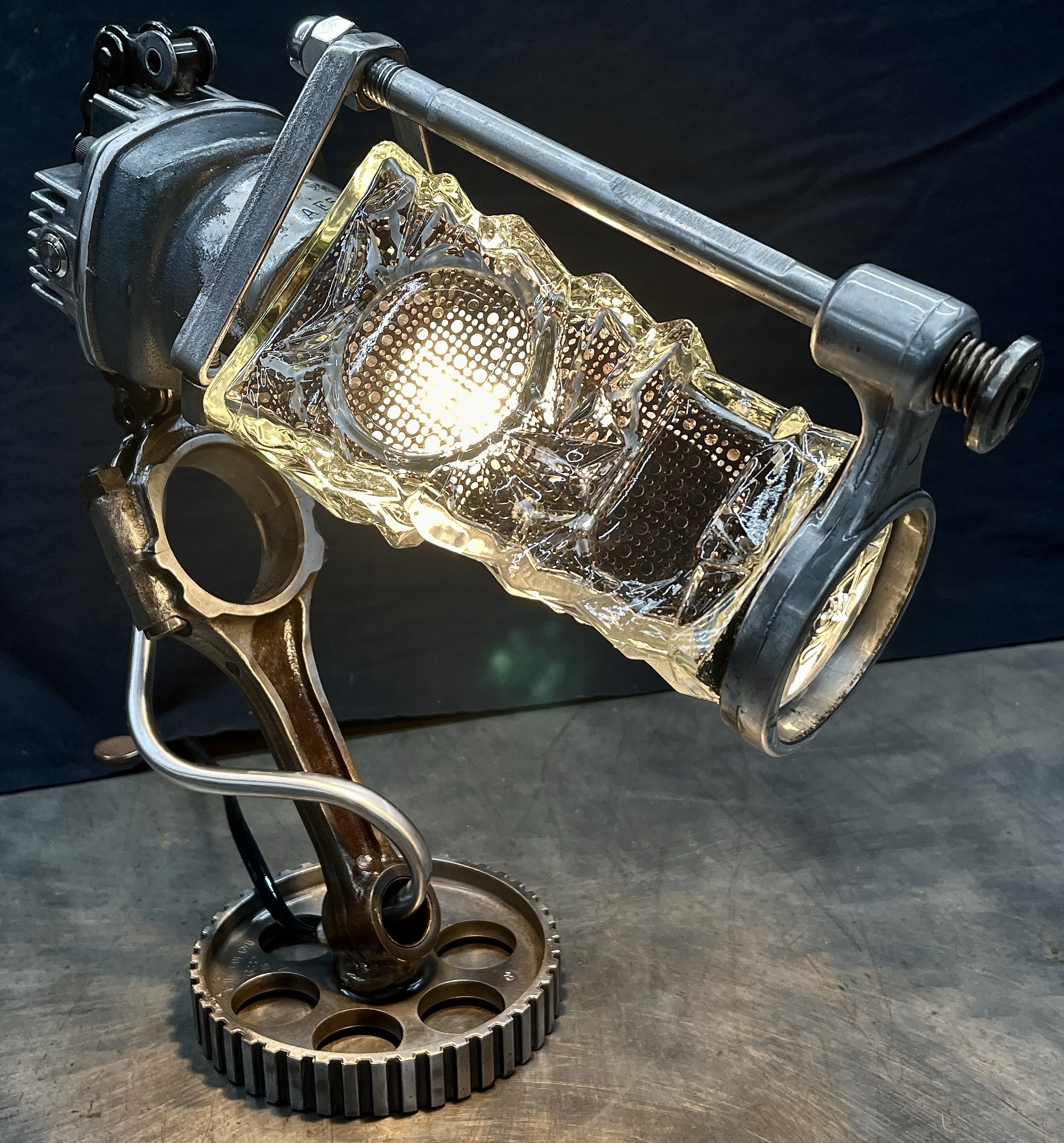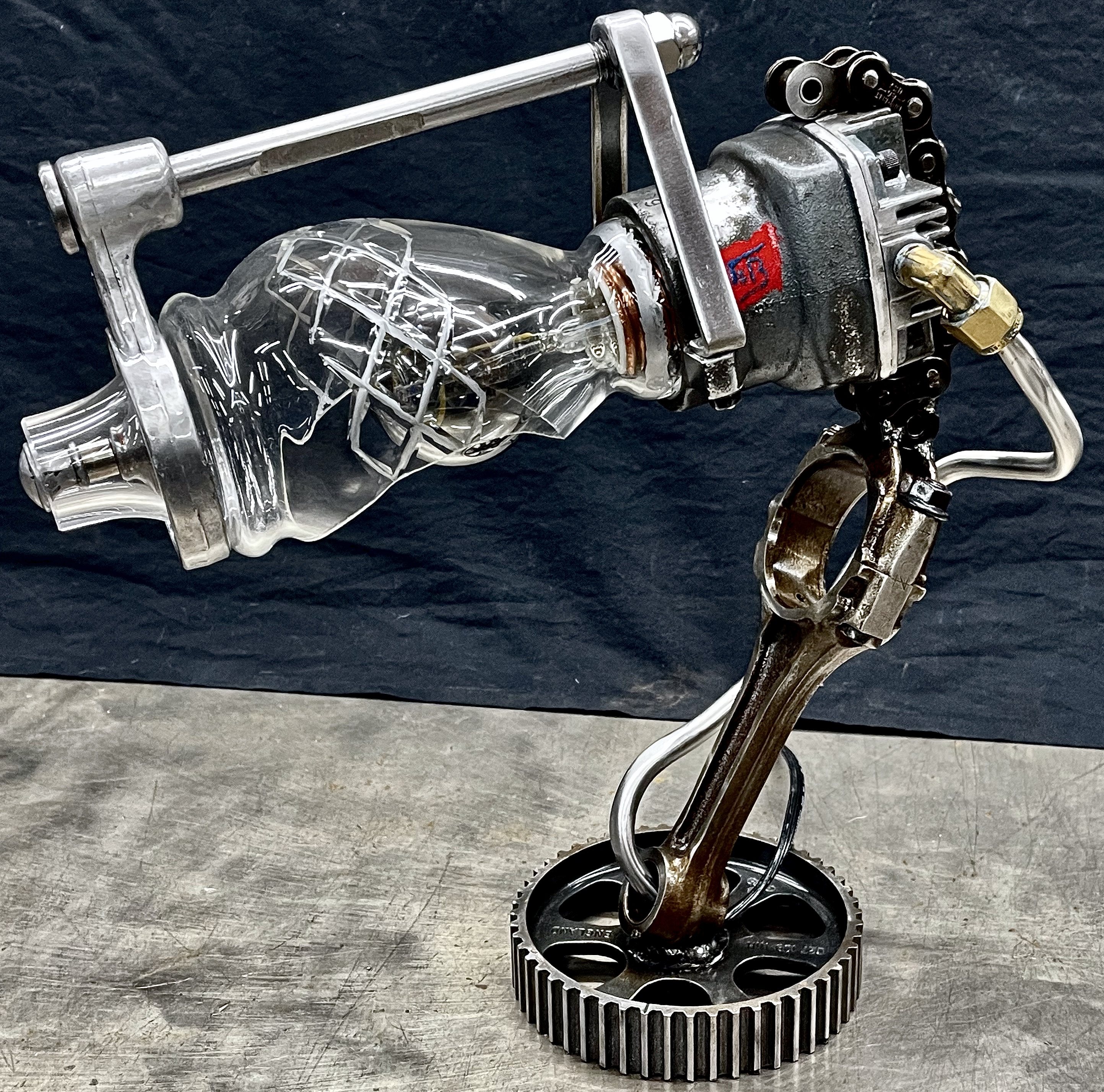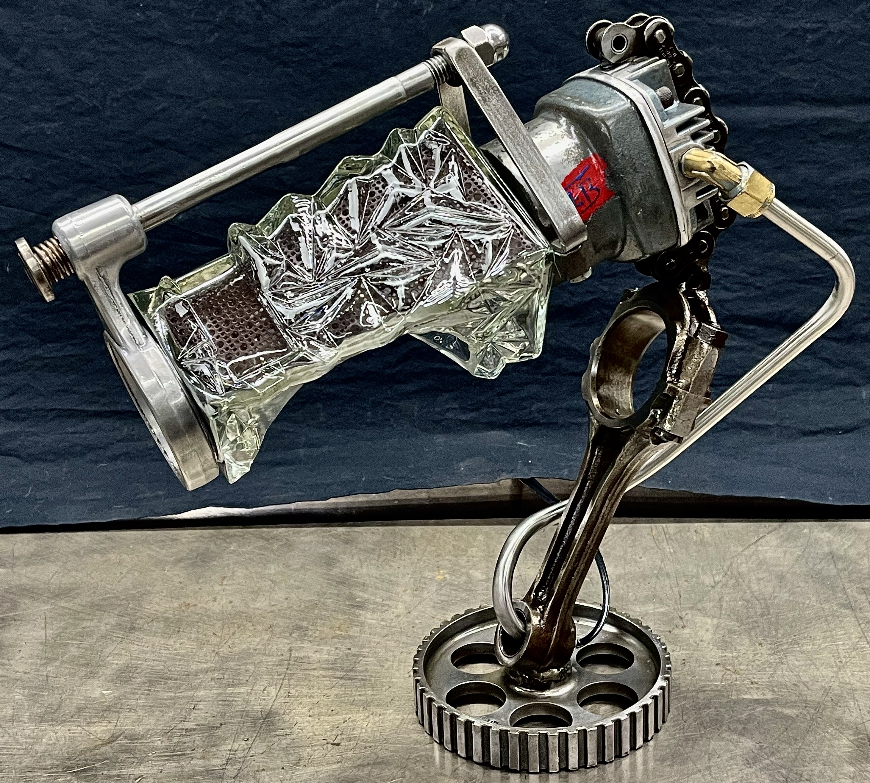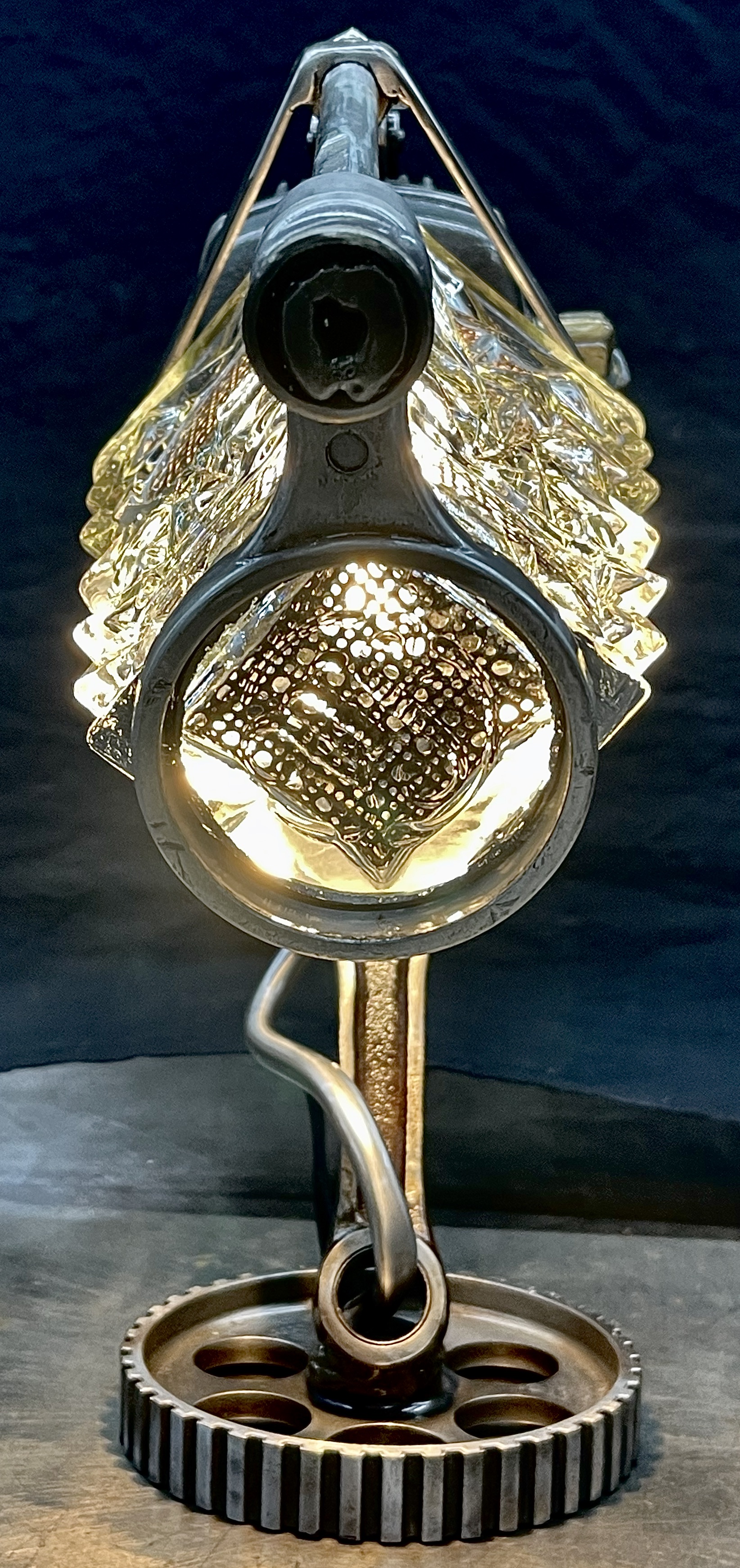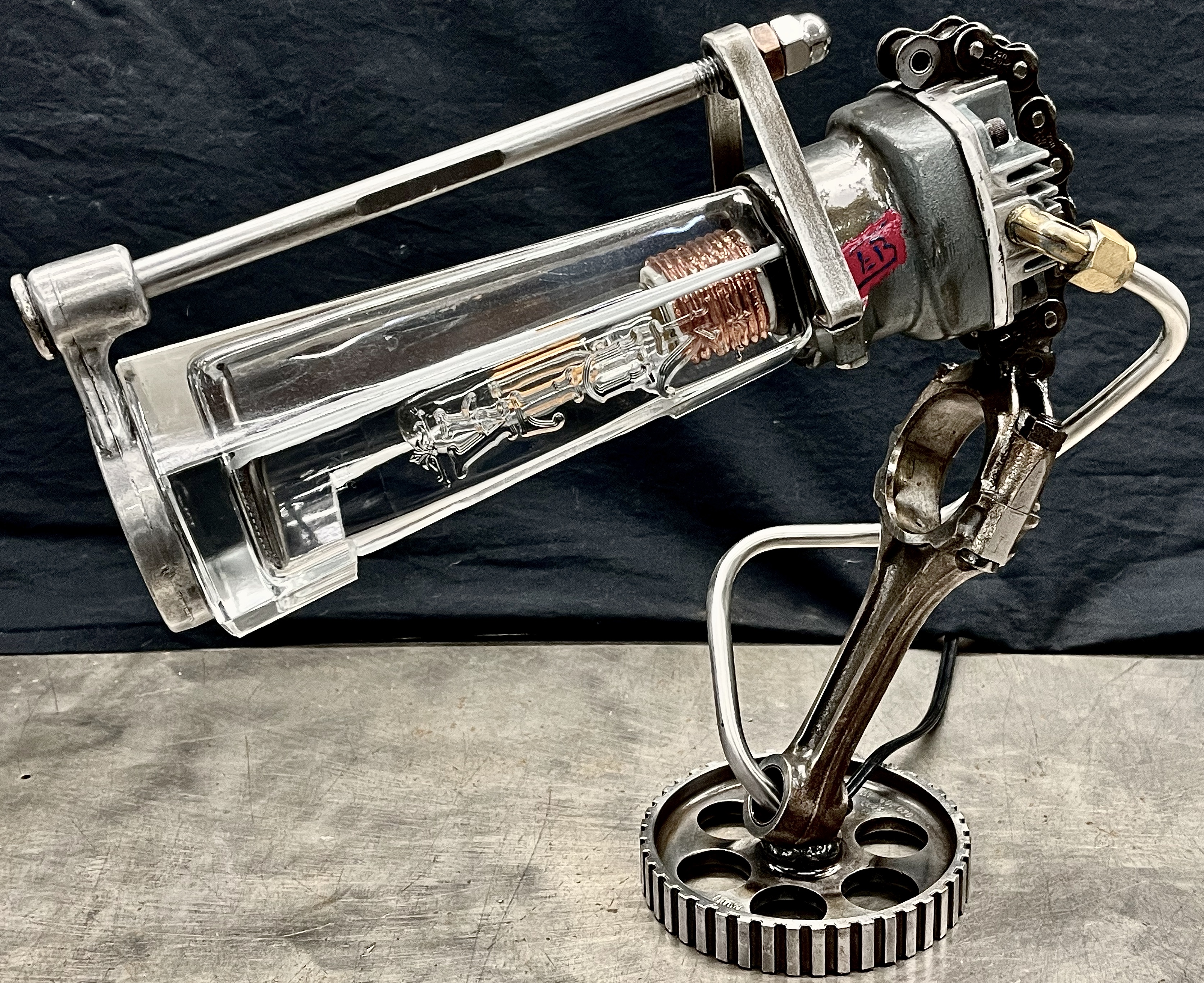 Why make only one lamp when you can make four instead? Because it’s a huge pain in the butt. I probably should have known this when I first came up with the idea, but then again, ‘bad decisions’ are kind of my wheelhouse. Lets rewind a little, a friend (we’ll call her ‘Helga’) texted me a picture of (what I later found out was) a sceptic tank aerator system air compressor that she found on the curb, and asked if I wanted her to grab it. I almost never say ‘no’ to trash, so I responded with an enthusiastic “sure.” After breaking it down and clearing out all of the spider carcasses/roach eggs, I was left with four aluminum compression cylinders/pistons and a bunch of brass air fittings. I thought to myself, “these would be really cool to fit a bottle into to make some lamps” and then promptly shoved everything to the side and did something else. Fast-forward nine months and I’m standing at my welding table with an empty tequila bottle that another friend had given us, thinking it would make a really cool lamp, and looking around at parts that I could use to flesh it out. Thats when I remembered the compressor cylinders, and the idea for one lamp was set. Problem was, I had four of those cylinders, and I was going to use all of them for lamps eventually anyway right? So why not just make four matching lamps right out of the gate? (for the correct answer, see above) What makes ‘Four’ so much more of a pain than ‘One’? Well, when you mostly make stuff out of junk, parts mostly don’t come in fours, and once you do have four of mostly matching sets, you get to degrease/polish/fit everything. The result is that, as soon as you’re ‘done’ doing something, you get to do it again three more times. To break up the monotony I elected to use a different style of bottle for each of the lamps. All in all I’m happy with these little lamps, and it is nice to see an idea that is solid enough that it can be repeated successfully, even when I hope never to repeat-repeat-repeat-repeat it again. Anyway, I hope you like them, and thanks again Kate.
