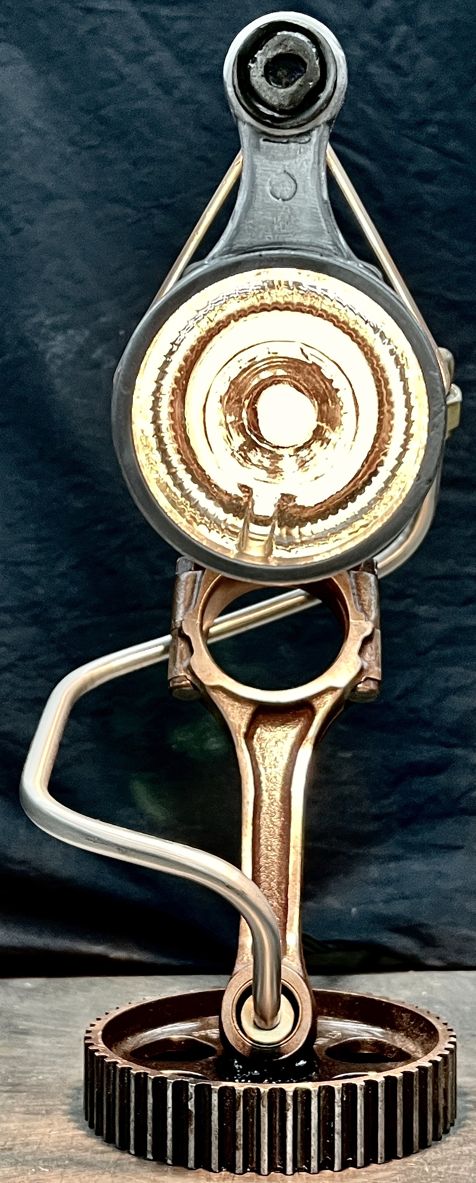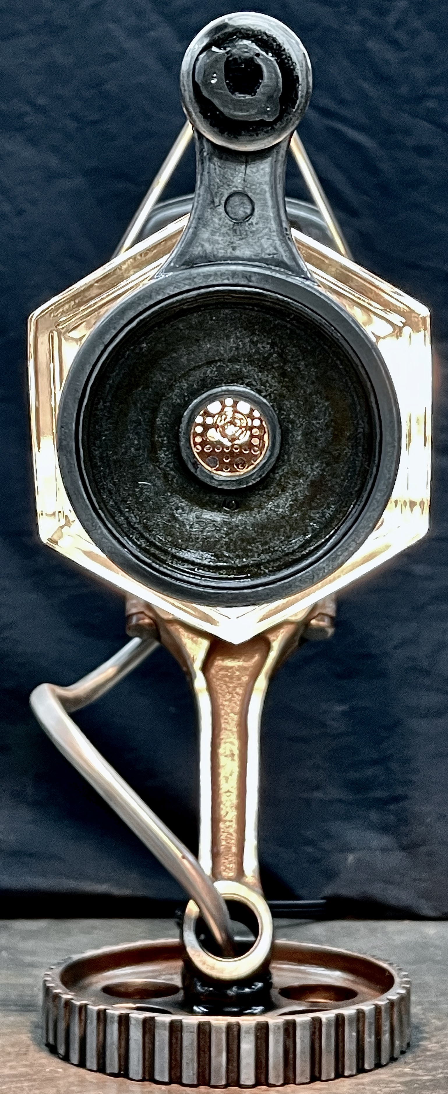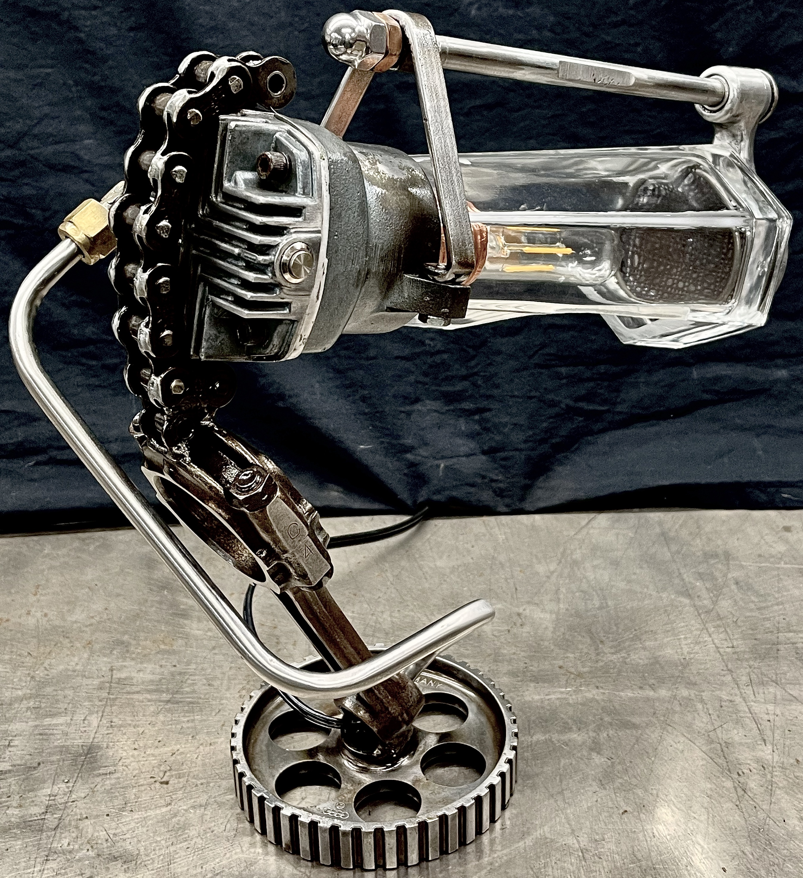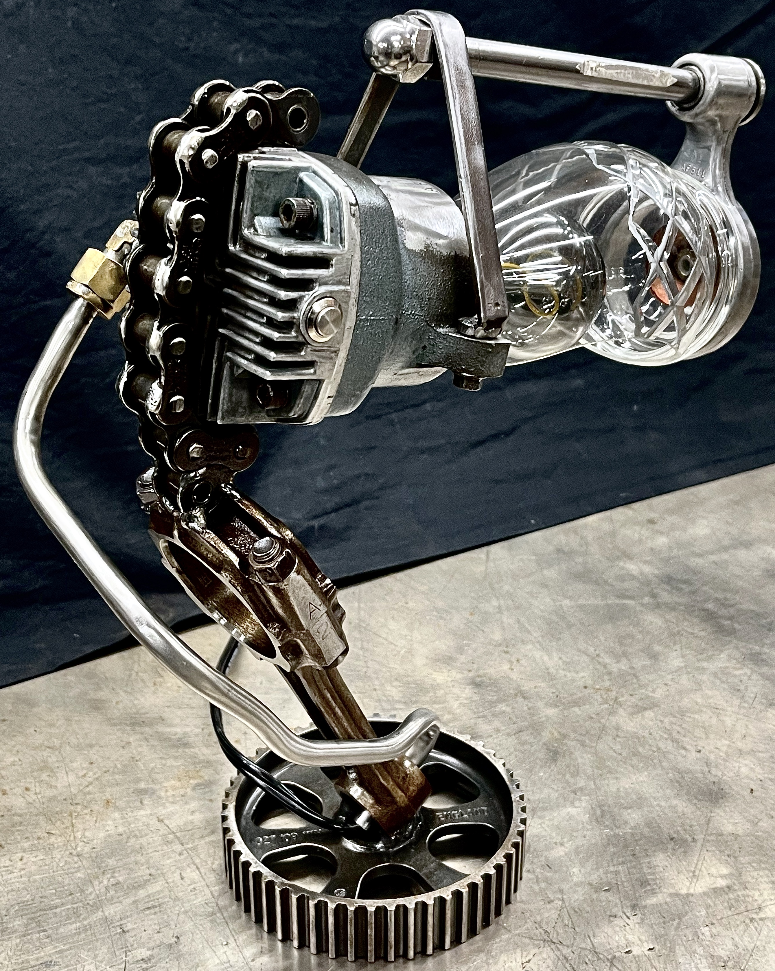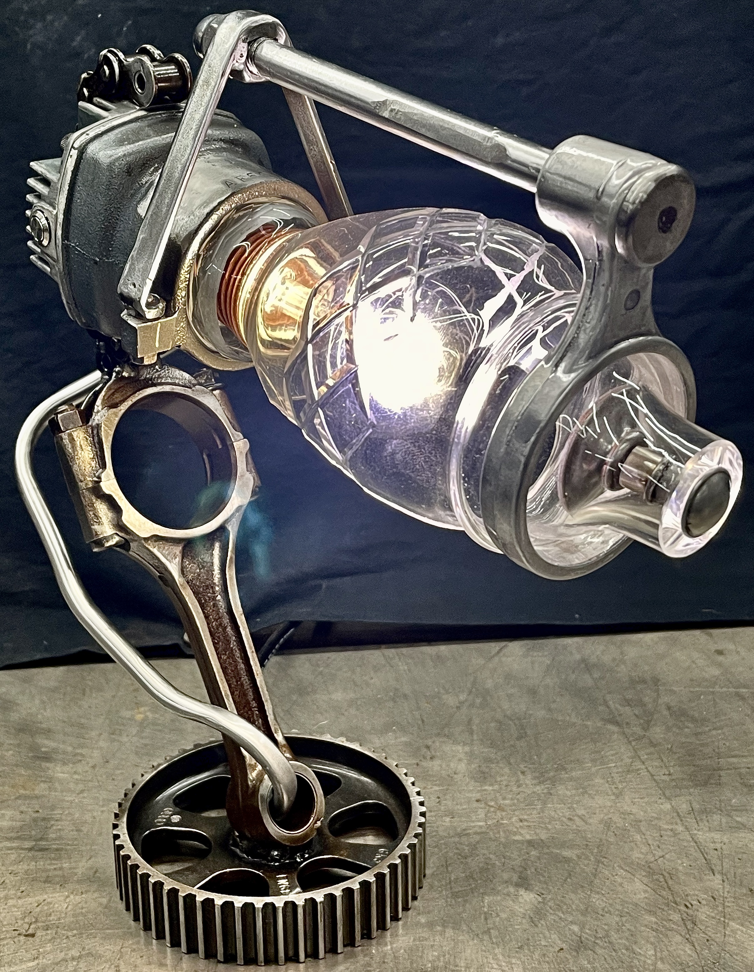 Why make only one lamp when you can make four instead? Because it’s a huge pain in the butt. I probably should have known this when I first came up with the idea, but then again, ‘bad decisions’ are kind of my wheelhouse. Lets rewind a little, a friend (we’ll call her ‘Helga’) texted me a picture of (what I later found out was) a sceptic tank aerator system air compressor that she found on the curb, and asked if I wanted her to grab it. I almost never say ‘no’ to trash, so I responded with an enthusiastic “sure.” After breaking it down and clearing out all of the spider carcasses/roach eggs, I was left with four aluminum compression cylinders/pistons and a bunch of brass air fittings. I thought to myself, “these would be really cool to fit a bottle into to make some lamps” and then promptly shoved everything to the side and did something else. Fast-forward nine months and I’m standing at my welding table with an empty tequila bottle that another friend had given us, thinking it would make a really cool lamp, and looking around at parts that I could use to flesh it out. Thats when I remembered the compressor cylinders, and the idea for one lamp was set. Problem was, I had four of those cylinders, and I was going to use all of them for lamps eventually anyway right? So why not just make four matching lamps right out of the gate? (for the correct answer, see above) What makes ‘Four’ so much more of a pain than ‘One’? Well, when you mostly make stuff out of junk, parts mostly don’t come in fours, and once you do have four of mostly matching sets, you get to degrease/polish/fit everything. The result is that, as soon as you’re ‘done’ doing something, you get to do it again three more times. To break up the monotony I elected to use a different style of bottle for each of the lamps. All in all I’m happy with these little lamps, and it is nice to see an idea that is solid enough that it can be repeated successfully, even when I hope never to repeat-repeat-repeat-repeat it again. Anyway, I hope you like them, and thanks again Kate.