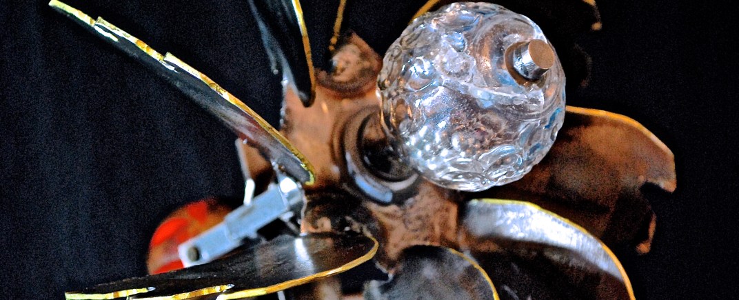 More often than not, my projects go through a stall period. I get an idea or pick up a part that I see as something new, and then I get stuck. Sometimes because I’m not sure how to make it work the way I see it in my head, other times I’m can’t seem to find the right elements. On occasion however, I pick up a glass wine stopper, slide a broken awl into it, and I’m off to the races. An old jigsaw bracket, a section of a jeep ring gear, 16 piano tuning keys, a lawn mower head, and a bearing welded to a cut-up circular saw blade… It all came together stall free, and this flower left my shop ready to soak up the sun.