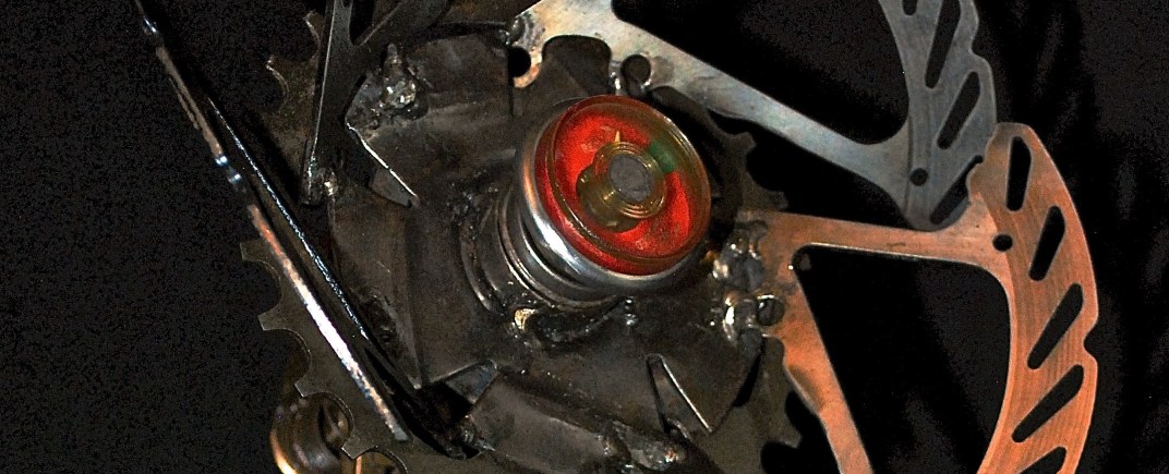 It might be my background in espresso, but whenever I see anything brass my palms get a little sweaty. Brass can’t be joined to other metals through the welding process that I use, so I have to be more creative in the ways that I work it in. Here, for example, I pressed parts together or drilled and tapped new holes to screw parts together. For the blossom I added a bicycle sprocket, a flattened turbine from a jeep water pump, and a reworked bicycle brake rotor. The base and lower stem are comprised of a jaw from a crescent wrench, a steering wheel mounting bracket, a tapered roller bearing, and some brake rotor leaves. I finished the flower off with a gauge from a spent fire extinguisher to give it an extra bit of eye-catching color.