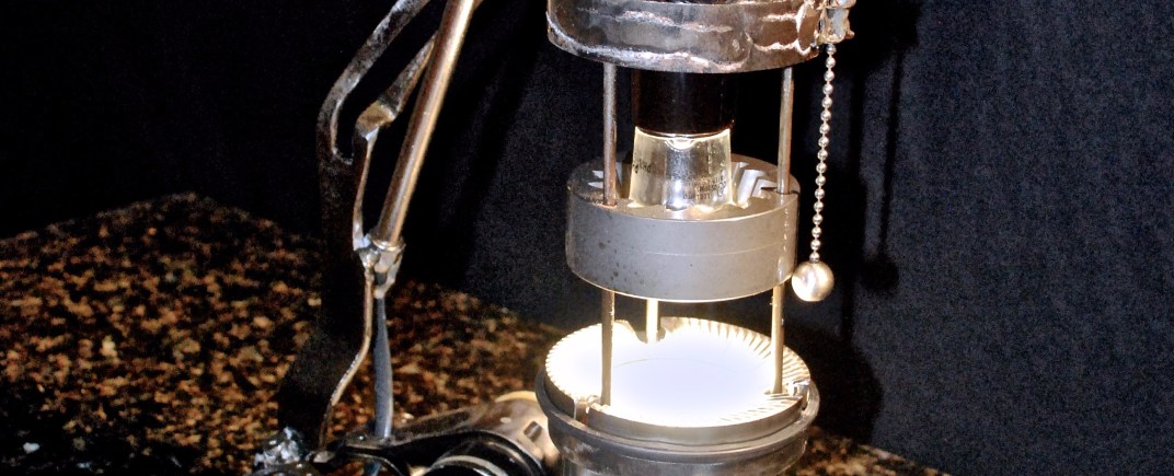 Looks can be deceiving, and deceiving can be involved. Unlike most of the lamps that I build, this project had its origin in a lightbulb that I wanted to use. I picked up an LED spot light, when I was buying bulbs for another project, because it was on sale. Being rather specific, it sat in my inventory for a long time waiting for the right lamp to call home. As is often the case with materials I collect, I got tired of looking at it and so set out to use it up. I took six espresso grinder burrs to make a cage for the bulb and pull-chain activated socket and then hung it from some empty CO2 cartridges attached to a section of square bike-lock chain that I picked up off the street in NYC. I welded the chain to an alternator bracket from an old Jeep engine, and made feet from a set of chair tilt tensioners that I had lying around that are balanced by a third foot made from another two espresso burrs. I then added the reflector from a flashlight, and as a joke I screwed the tiny light bulb from that flashlight into the reflector and found the finishing touch. Because the spotlight shines directly on the flashlight bulb, it appears as if the light is all coming from that tiny bulb, and that the chain is carrying a small crucible of molten light.