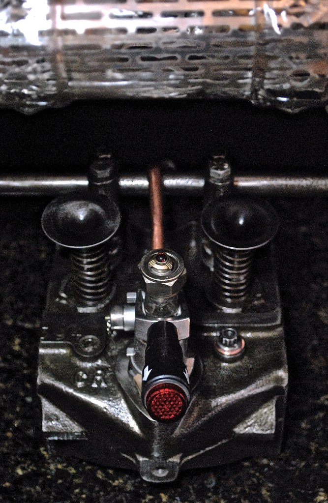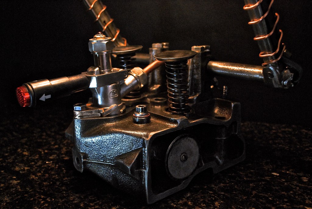 How heavy is too heavy for a desk lamp?  At almost thirty pounds, this one has got to be close.  Originating with an antique bottle, my next thought was to suspend it between two electrical insulators that I could set the light sockets into.  From there I used a set of piston rods from an old jeep engine and fixed them in-place on that engine’s valve shaft.  From there it only made sense to bolt the shaft back onto part of the engine head that I had previously cut into thirds, that’s when things really got heavy.  This cast iron head is no joke, but I’ll never have to worry about this lamp tipping over.  I flipped the valves and springs to protrude from the top of the head, then modified a keg tap to function as the power switch.  Holding tight to the engine theme, I modified some spark plugs to provide the power connection for the light assembly and screwed them into place.  I finished it off by adding heavy gauge copper wire around the piston rods, some copper pipe from the back of the switch to the head, and some espresso machine shower screens to block off the intake channel.