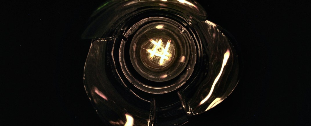 They say that beauty is in the eye of the beholder, what I try to do is widen the audience.  This lamp originated with an espresso machine piston and a brass toilet tank valve, elements that were originally hidden in their intended operation.  I used the espresso piston to hold the lamp socket, and set it inside an antique bottle.  The toilet valve then went into the neck of the bottle to direct the wires and to support the lamp head in conjunction with an aircraft pipe clamp and a rocker arm support from a jeep F-head engine.  I dressed that up with two jeep distributer gears, and then welded sections from a jeep flywheel ring gear down to a jeep crank shaft pulley.  That got inset into a 4″ pipe coupling mounted on a jeep differential ring gear.  Two sections of copper pipe held in place with heavy gauge copper wire hide the electrical wiring as it travels down to the base.  I then moved back up and made the lamp shroud by affixing sections of glass bottles trimmed with copper wire to a pair of crank shaft bearings.  To finish it off I needed to come up with a switch, and rather than settle for a simple toggle, I opted for a key activated switch.  Turn the key, and ignite the beauty of the unseen.