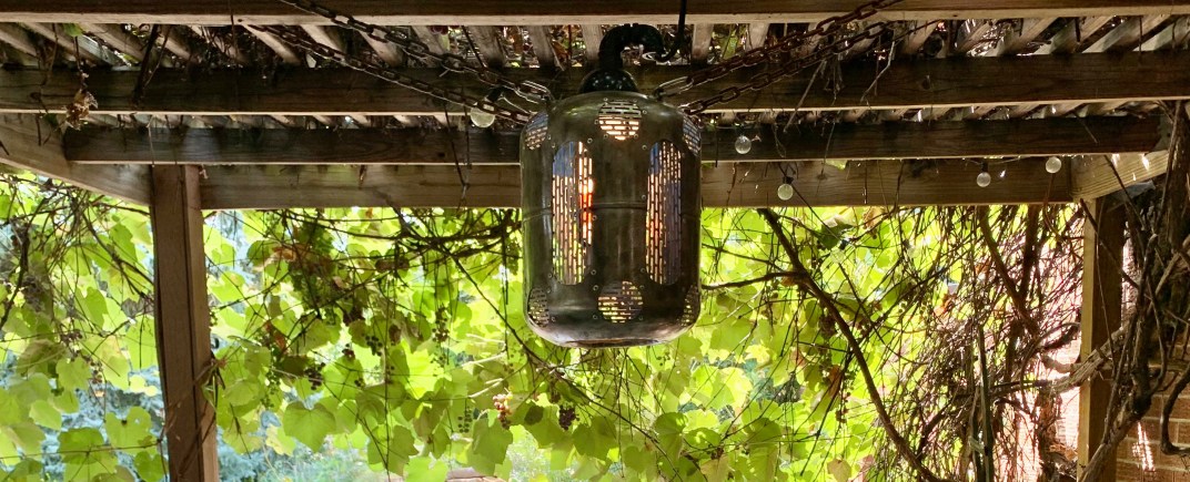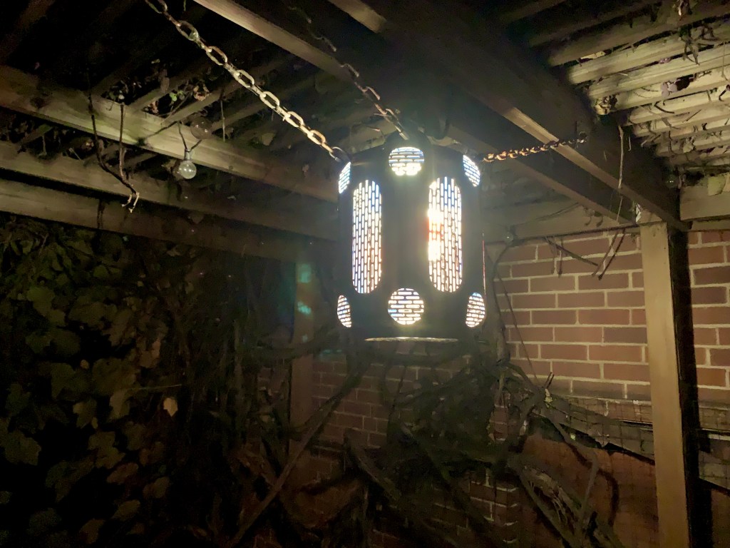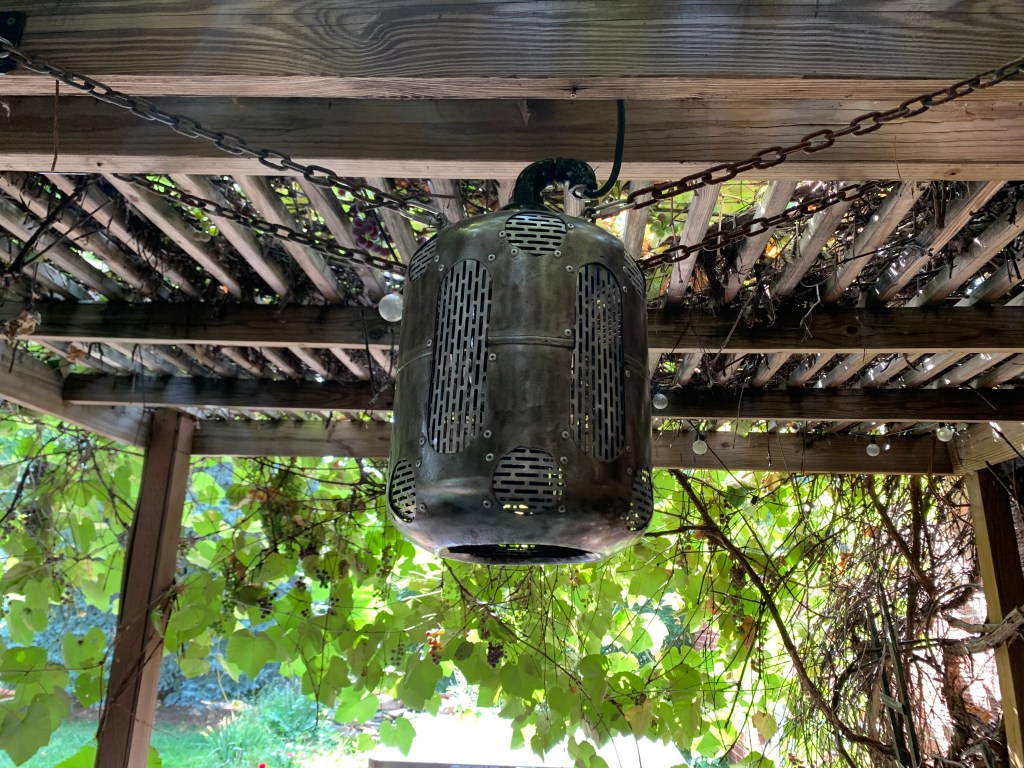 I was talking with a good friend in Colorado, and I brought up a hanging lamp idea I was kicking around. His response was that something like that would be awesome over his patio table. Normally, I make stuff and then hope someone will want it. Having someone say up front that they want whatever I can turn out is infinitely better; so I got to work. The idea was to take an empty r-22 tank and cut openings in it so it would resemble a Chinese paper lantern. The next step was to screen the openings to diffuse the light coming out which I did by riveting in stamped aluminum sheets. The result turned out pretty cool in my opinion, although drilling a hundred and ninety-eight holes on the curved surface of the lamp body so I could set the rivets was no where near as much fun as you might think. Before attaching the aluminum screens, I polished the exterior and then clear-coated it with a ceramic automotive enamel, painted the lamp interior ‘old’ Ford Blue. For the actual light portion, I used a commercial-grade exterior fixture that has it’s own screw-in glass cover and metal cage. Aside from the convenience of being something that I had laying around, I wanted to be confident that it would be as weather-proof as possible. I finished it off with a 20′ cord and an all-weather plug, built a crate, and took it to the post office. The USPS proceed to lose track of the package for over a month, but in the end it arrived undamaged. Suspended from four runs of de-galvanized chain, the chandelier looks like some kind of anachronistic pirate ship cabin lamp, casting just the right amount of light for a Caribbean cruise at the foot of the Colorado Rockies.