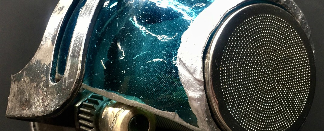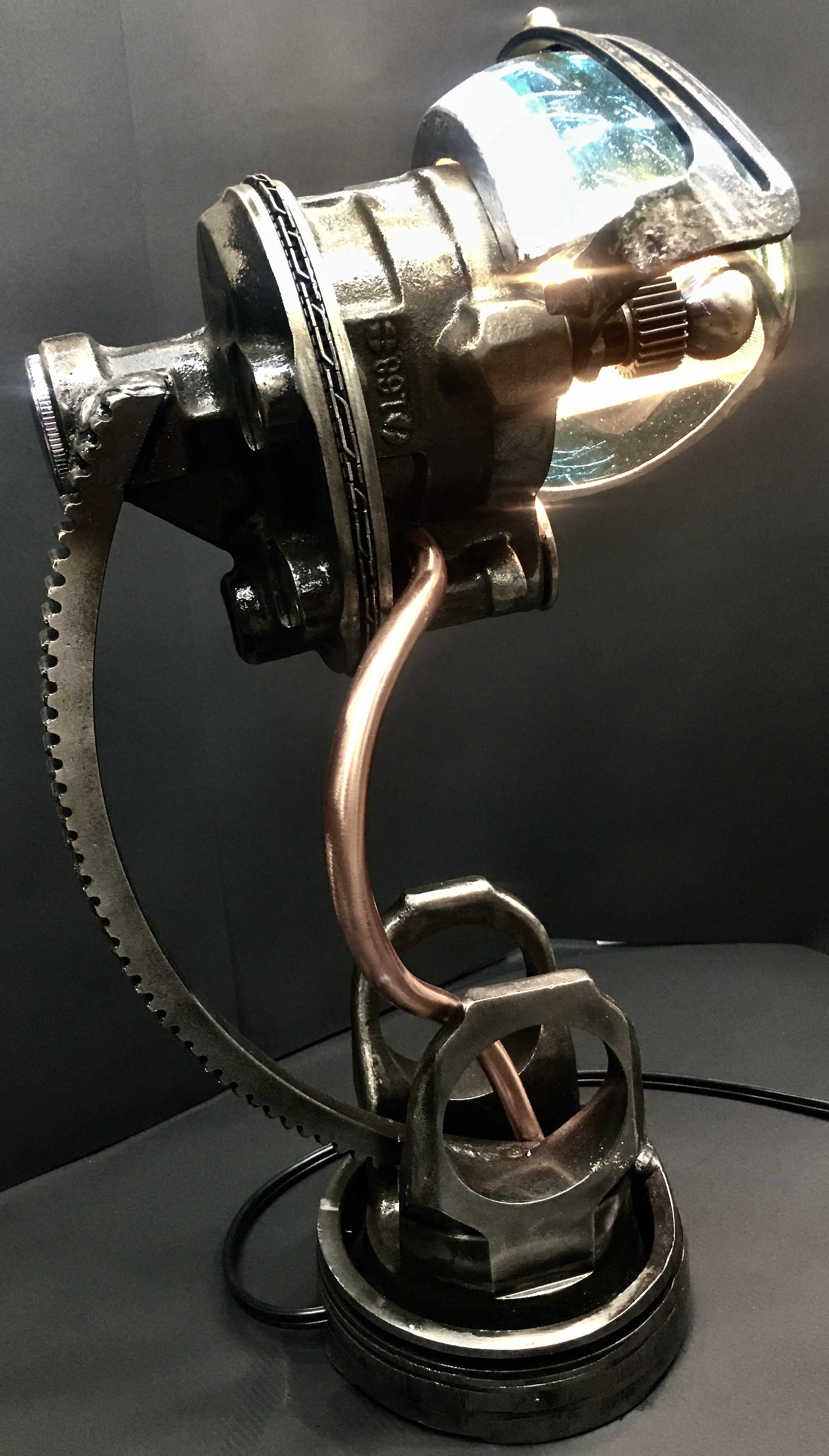 My wife works in the field of statistics, and as such collaborates with scientists around the country (and globe now that I think of it) and is always eager to share my website/art with anyone she talks to. I appreciate that she does this, but I don’t generally give it a lot of thought. One collaborator however, actually took the bait and made a point to bring up my art on a regular basis, always asking what new things I was working on and that he wished he had space in his apartment for something I’d made. He also took every opportunity to motivate my wife in her research, introduced her to and spoke highly of her to other senior researchers, and encouraged her to pursue research that had real-world implications instead of drudging through theory that the field tends to over value. Some people write ‘thank you’ cards, I make lamps. The result is a small (although not exactly light) desk lamp that looks like it grew out of a mad man’s dystopian garage. Which, I guess, it did. The power steering pump body is suspended by a section of a jeep’s flywheel ring gear above a piston cup from an industrial diesel. Wiring is run up through a section of copper tubing to a switch that is illuminated when the lamp is off. Shading the bulb, is (was) a section of a blown glass tequila bottle that can be pivoted away from the body by means of guide rail from an old Craftsman jigsaw. Surrounding the bulb is fine-mesh stainless steel tea strainer. Not to over simplify things, I added a brass quarter-turn ball valve with a tiny glass insert, a free-spinning gear from a tubing expander, and a chromed brass cap from a KitchenAid stand mixer. All-in-all, a quick little lamp to say “Thank You,” and a convenient excuse to get that brain-splinter of a power steering pump out of my life.