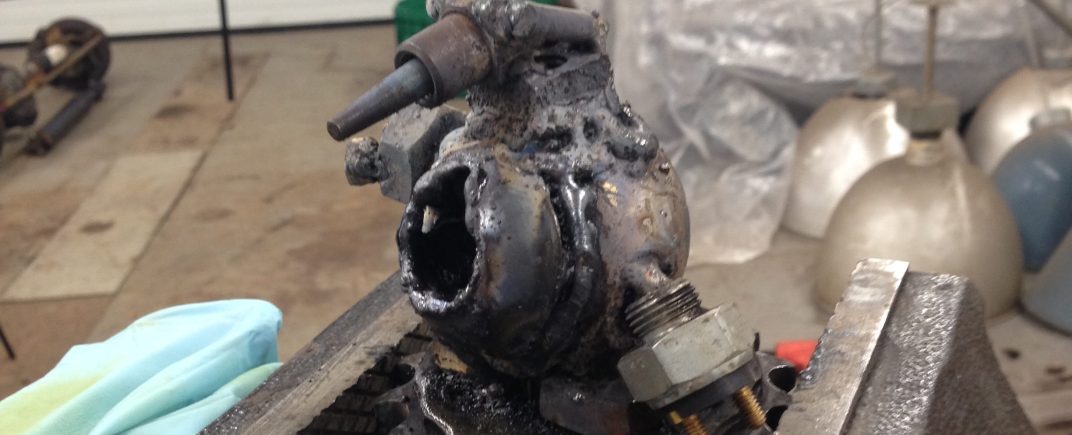 Because most of my projects develop piece by piece, things tend to change and ideas that seem great at first, don’t always work out. The body of this little penguin is actually the ball from a truck hitch that I found in the street, and initially I had planned to capture a yellow turn-signal bulb in the socket to add a little color to the stomach. Everything was looking pretty cool until I started cleaning up the welds around the lightbulb and it’s glass shattered. Suddenly my little penguin had a gaping hole in his stomach with a bunch of mangled filament wires sticking out; not exactly the look I was going for. To cap it off, the semi-spherical piece holding the light in would have to be cut up to get the broken bulb out, and it was the only piece I had like that. Sometimes that’s how it goes when you work with scavenged parts, and so a bolt head took the place of the lightbulb and I learned to be a lot more careful around hot glass.